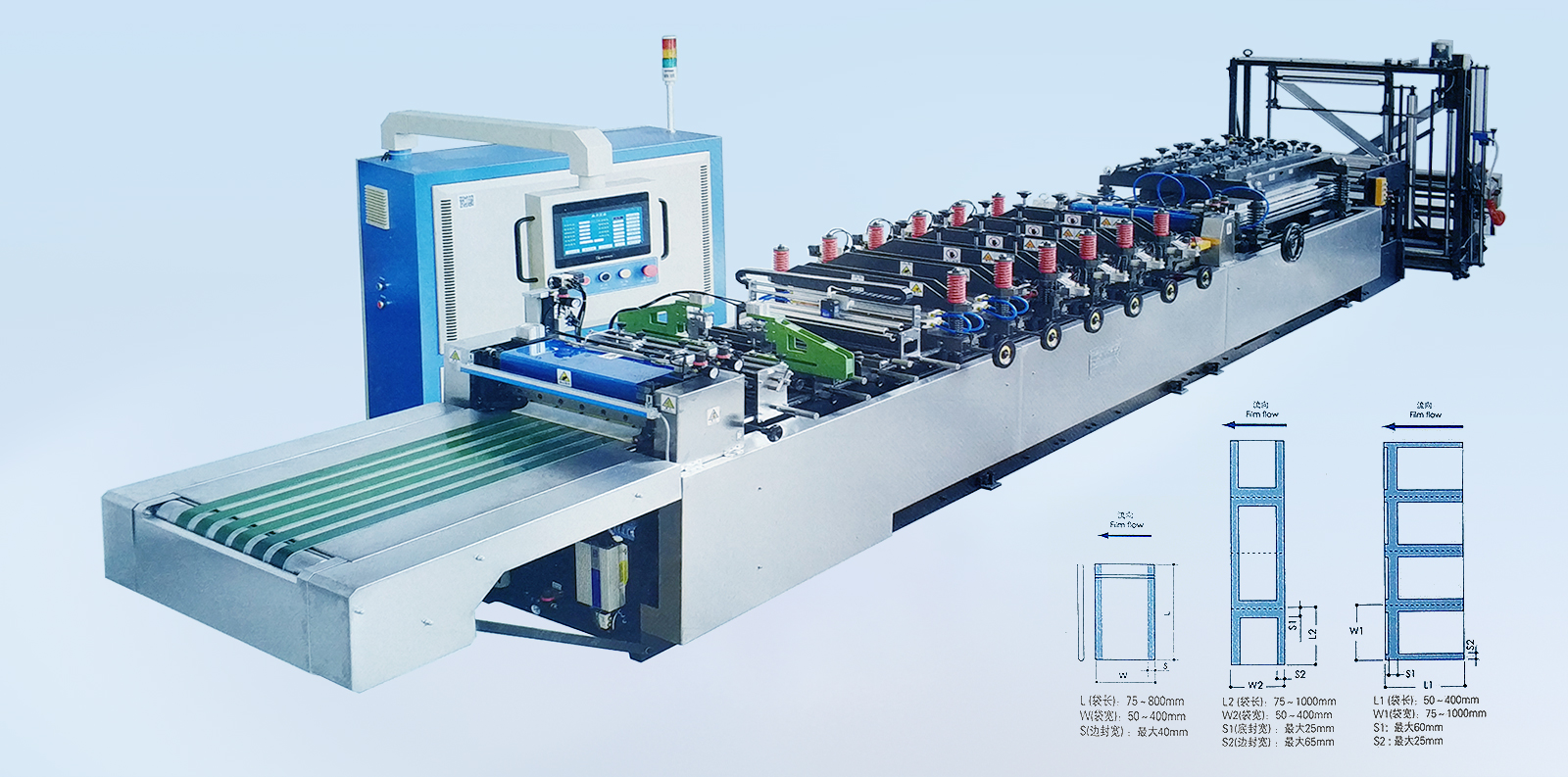 材料:各種復(fù)合薄膜。 卷筒:寬度≤1200mm,直徑≤800mm。 制袋速度:180段/分(機(jī)械設(shè)計(jì)速度)約<40m/min。 制袋寬度:≤500mm。 制袋長度:50-400mm,制袋長度超過400mm 以上應(yīng)采用倍送功能。